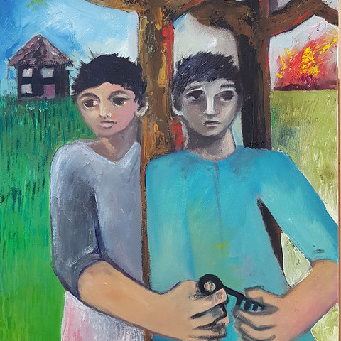 As I work towards the upcoming exhibition in May 2020, (details to follow so stay tuned), it occurred to me that I had a couple of paintings that I did many years ago. They were in response to an equally devastating fire and I felt they should be included in this exhibition too. In a way, to show that my concern about how humans have impacted on the natural world has been an enduring thread of my work. That's because I genuinely feel this way. So the hunt began, to track down these two paintings that I realised I had not set eyes on for nearly 15 years. Since then I had moved perhaps four or five times. I called these works, they belong together, Parallel Universe I and Parallel Universe II. The scene is time based, as a man drops a live match into the forest, the animal spirits look on, unable to stop him. The other painting shows the same scene, scorched. The match, is burnt and is all that remains of that shortsighted action.